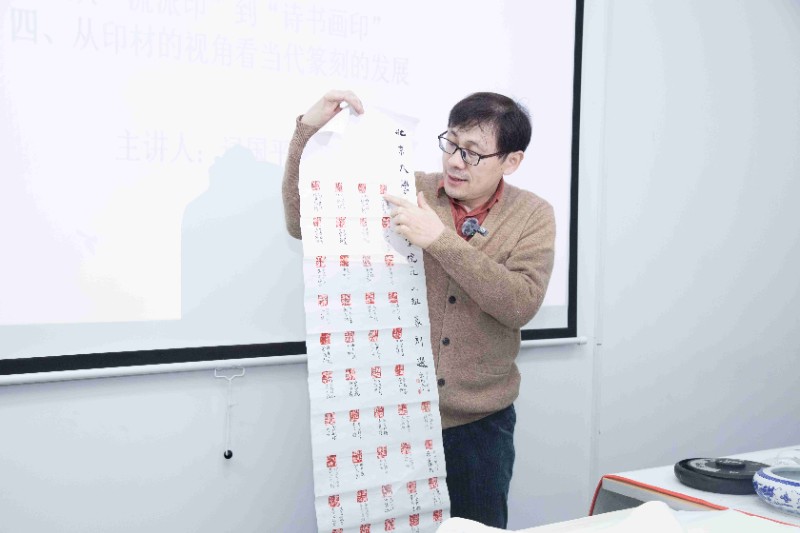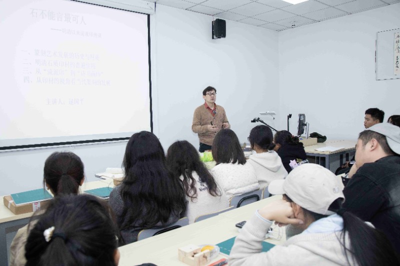书法名师逯国平老师带来的篆刻艺术课程“石不能言最可人…明清以来流派印漫谈”圆满落下帷幕,吸引了众多艺术爱好者前来聆听。课堂上掌声不断。“操刀如笔石为纸,方寸之间天地宽。”篆刻艺术,实乃博大精深,于小小印章之上尽显无尽韵味与巧思。诚如法国雕塑家罗丹所言:“生活中不是缺少美,而是缺少发现美的眼睛。”篆刻艺术便是那等待着我们去用心发现的美之瑰宝。 在此次课程中,逯国平老师先是详尽地讲解了篆刻艺术发展的历史与所涉及的材质,尤其着重阐述了明清时期石质印材的普遍使用,及其对篆刻艺术发展起到的有力推动作用。逯老师深入解读了从流派印到“诗书画印”的演变历程,生动展现了不同艺术形式相互融合所碰撞出的奇妙火花。逯老师从印材的视角探讨了当代篆刻艺术的发展态势,为学员们开启了展望未来的新思路。逯老师讲解精彩生动、深入浅出,此次课程无疑为广大篆刻艺术爱好者搭建了一个优质的学习与交流平台。希望在今后的日子里,大家能怀揣着对篆刻艺术的这份热爱,如同追逐璀璨星辰般,继续深入探索这片艺术的浩瀚星空,不断前来汲取知识的养分,让篆刻艺术在我们的生活中绽放出更加绚烂的光彩,让那方寸之间的美妙世界永远散发着迷人的魅力!